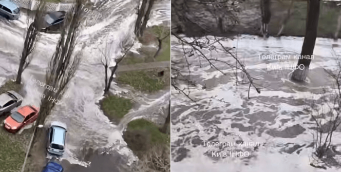 У Києві на бульварі Верховної Ради прорвало трубу, через що вулицю та прилеглі двори залило водою | Фото: Скриншот з відео У Києві на бульварі Верховної Ради прорвало трубу, через що вулицю та прилеглі двори залило водою. Потоп охопив значну…