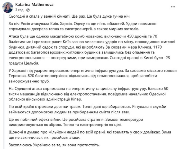 “Це не побічний ефект війни. Це російська стратегія. Зимові температури використовують як зброю. Тепло та електроенергія, як цілі. Щоночі я думаю про мільйони людей по всій країні, які тремтять у своїх домівках. Зима ще не скінчилася, як і російські атаки. Захоплююся Україною за те, як вона протистоїть”, — пише Матернова.